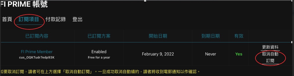 (如果是信用咭過期,點擊右上角人像圖示進入「FI PRIME帳號」,再點擊訂閱項目,在已訂閱內容一欄會顯示讀者所訂閱的專欄,點擊最右邊的「更新資料」按鈕,即可更新信用卡號碼。)