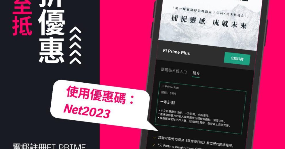 訂閱「FI Prime Plus」(一年計劃)只需港幣 $998,每日少於港幣 $3!(華爾街日報官網一年價格約港幣$2,9...