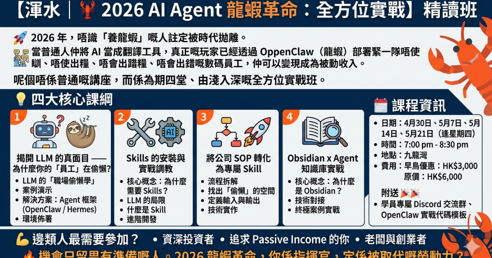 【渾水|🦞 2026 AI Agent 龍蝦革命:全方位實戰】精讀班 FI Prime Member 渾水 April 20, 2026 Share This! Facebook WhatsApp Copy Link 18 【渾水|🦞 2026 AI Agent 龍蝦革命:全方位實戰】精讀班 🚀 2026 年,唔識「養龍蝦」嘅人註定被時代拋離。 當普通人仲將 AI 當成翻... 馬上成為FI PRIME會員 會員專區 只限會員閱讀 歡迎登入FI PRIME 使用者名稱 / 電郵 密碼 維持我的登入狀態 還未成為FI PRIME會員? 立即訂閱 收看更多精彩內容! 忘記密碼? Read These Water Podcast:我另一隻倉重注了三倍贏更多!但它只在倫交所可交易。紐約香港倫敦三地的時差如何影響股票槓桿式產品的操作? Water Podcast:某贏大錢股票有機會在4月XX日有波動,必須在此限期前執行一個動作! Water Podcast:某贏大錢股票兩倍ETF如何妥善處理離場戰略?有一陷阱位要高度注意! 閱讀更多文章 FOLLOW US FOLLOW ON INSTAGRAM Hot Posts最後入圍,三位佳麗R10:潘頓由頭「勁」到尾!有紅印我唔要架~個世界只有得同唔得R8:艾兆禮有信心可奪「金」!