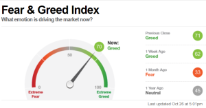 美股貪婪與恐慌指數到達了70 的貪婪區域, 若果到達75, 就是極度貪婪, 突然向下的風險就是開始增加, 現時仍然處於業績期, 大部分公司財報較市場預期好, 本周也沒有重要經濟數據, 目前美股市場仍然...
