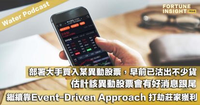 Water Podcast:部署大手買入某異動股票,早前已沽出不少貨。估計該異動股票會有好消息跟尾,繼續靠Event-Driven Approach 打劫莊家獲利