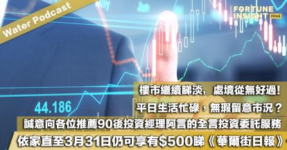 Water Podcast:樓市繼續睇淡,處境從無好過!平日生活忙碌,無瑕留意市況?誠意向各位推薦90後投資經理阿言的全言投資委託服務。依家直至3月31日仍可享有$500睇《華爾街日報》一年優惠