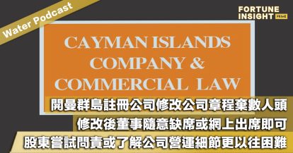 Water Podcast:開曼群島註冊公司修改公司章程棄數人頭,修改後董事隨意缺席或網上出席即可,股東嘗試問責或了解公司營運細節更以往困難