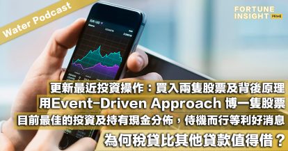 Water Podcast:更新最近投資操作:買入兩隻股票及背後原理 │ 用Event-Driven Approach 博一隻股票 │ 目前最佳的投資及持有現金分佈,侍機而行等利好消息 │ 為何稅貸比其他貸款值得借?